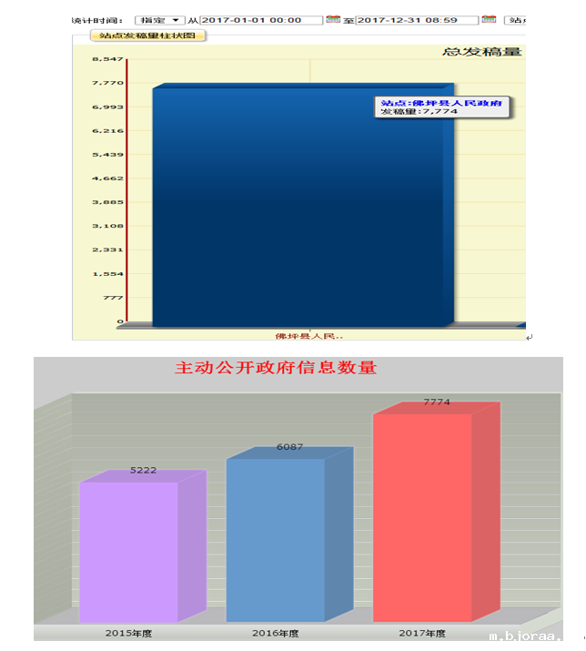 全县通过县政府门户网站主动公开政府信息7774条,比2016年增长28%。县政府门户网站发布工作动态信息2663条、政府文件47条、规划计划11条、招标采购145条、财政信息359条、环保信息120条、食品药品信息64条、旅游信息210条、脱贫攻坚信息1135条、其他信息2876条,发布县政府常务会议信息17次,对人大代表建议和政协委员提案办理情况进行了公开,公开政务通报42次。