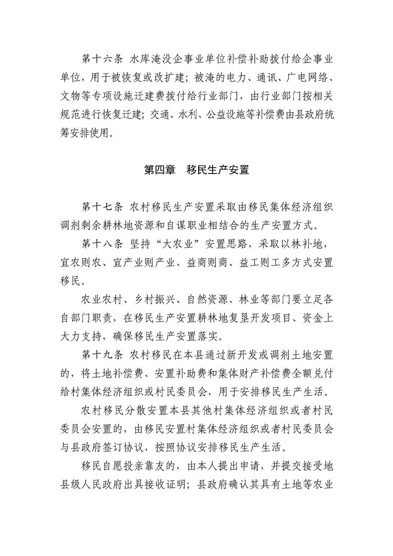 坚持“大农业”安置思路,采取以林补地,宜农则农、宜产业则产业、益商则商、益工则工多方式安置移民。农村移民在本县通过新开发或调剂土地安置的,将土地补偿费、安置补助费和集体财产补偿费全额兑付给村集体经济组织或村民委员会,用于安排移民生产生活。农村移民分散安置本县其他村集体经济组织或者村民委员会安置的,由移民安置村集体经济组织或者村民委员会与县政府签订协议,按照协议安排移民生产生活。移民自愿投亲靠友的,由本人提出申请,并提交接受地县级人民政府出具接收证明;县政府确认其具有土地等农业生产资料后,与接受地县级人民政府和移民共同签订协议安排移民生产生活,将个人财产补偿费和搬迁费等发给移民个人。移民选择自谋职业安置的,由本人提出申请提交村集体经济组织或村民委员会,经村民会议或村民代表会议讨论同意可使用征地补偿补助资金,用于就业和创业发展。