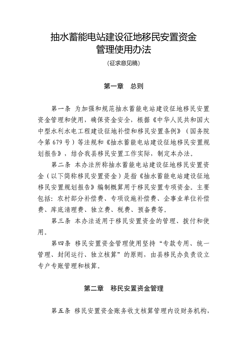 为了做好抽水蓄能电站建设征地移民安置工作,维护移民合法权益,保障工程建设顺利进行,加强和规范抽水蓄能电站建设征地移民安置资金管理和使用,确保资金安全,根据国家和省市有关政策规定,结合我县实际,起草制定了《抽水蓄能电站建设征地移民安置办法》(征求意见稿)、《抽水蓄能电站建设征地移民安置资金管理使用办法》(征求意见稿),现面向社会公开征求意见和建议。