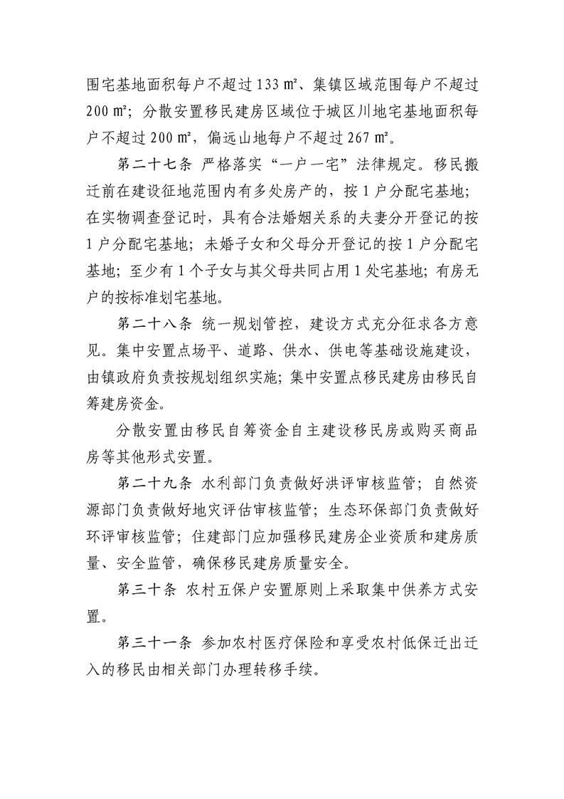 移民搬迁安置分为集中安置点安置和分散安置。镇人民政府负责与移民签订移民搬迁补偿协议并司法公证。集中安置点移民建房区域纳入城区规划范围宅基地面积每户不超过133㎡、集镇区域范围每户不超过200㎡;分散安置移民建房区域位于城区川地宅基地面积每户不超过200㎡,偏远山地每户不超过267㎡。严格落实“一户一宅”法律规定。移民搬迁前在建设征地范围内有多处房产的,按1户分配宅基地;在实物调查登记时,具有合法婚姻关系的夫妻分开登记的按1户分配宅基地;未婚子女和父母分开登记的按1户分配宅基地;至少有1个子女与其父母共同占用1处宅基地;有房无户的按标准划宅基地。农村五保户安置原则上采取集中供养方式安置。