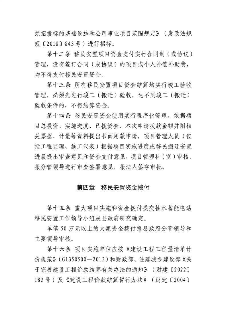 重大项目实施和资金拨付提交抽水蓄能电站移民安置工作领导小组或县政府研究确定。单笔50万元以上的大额资金拨付报县政府分管领导和主要领导审核。项目实施单位应按《建设工程工程量清单计价规范》(G1350500—2013)和财政部、住建城乡建设部《关于完善建设工程价款结算有关办法的通知》(财建〔2022〕183号)及《建设工程价款结算暂行办法》(财建〔2004〕369号)等相关规范做好工程合同价款期中支付、竣工结算支付管理。专项设施项目恢复建设资金按照下达的年度计划,由其行业部门完成,按移民安置规划方案投资与其签订实施合同(或协议)任务拨付,专项设施恢复建设部门应按要求提供项目建设的相关管理资料。永久征占地土地补偿费、安置补助费和集体财产补偿费由县移民办拨付县自然资源局土地储备交易资金专户,由县自然资源局拨付村组集体;临时用地补偿费县移民办直接拨付村组集体账户。搬迁费及移民个人私有财产补偿费直接兑付给移民。