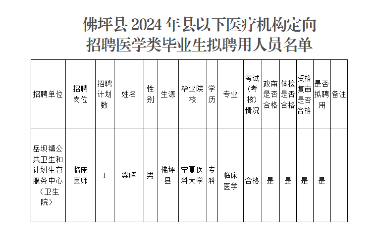 根据省人社厅等部门《关于做好2024年度为县以下医疗卫生机构定向招聘医学类毕业生有关工作的通知》和《2024年陕西省为县以下医疗卫生机构定向招聘医学类毕业生招聘公告》以及市人社局、市卫健委《关于做好2024年县以下医疗卫生机构定向招聘医学类毕业生后续工作的通知》(汉人社函〔2024〕138号)要求,经资格审查、考核、体检、考察、复审等程序,现将拟聘用人员情况进行公示,公示时间:2024年8月30日—9月5日。公示期间,如有异议,请及时向星空游戏平台人力资源和社会保障局反映。